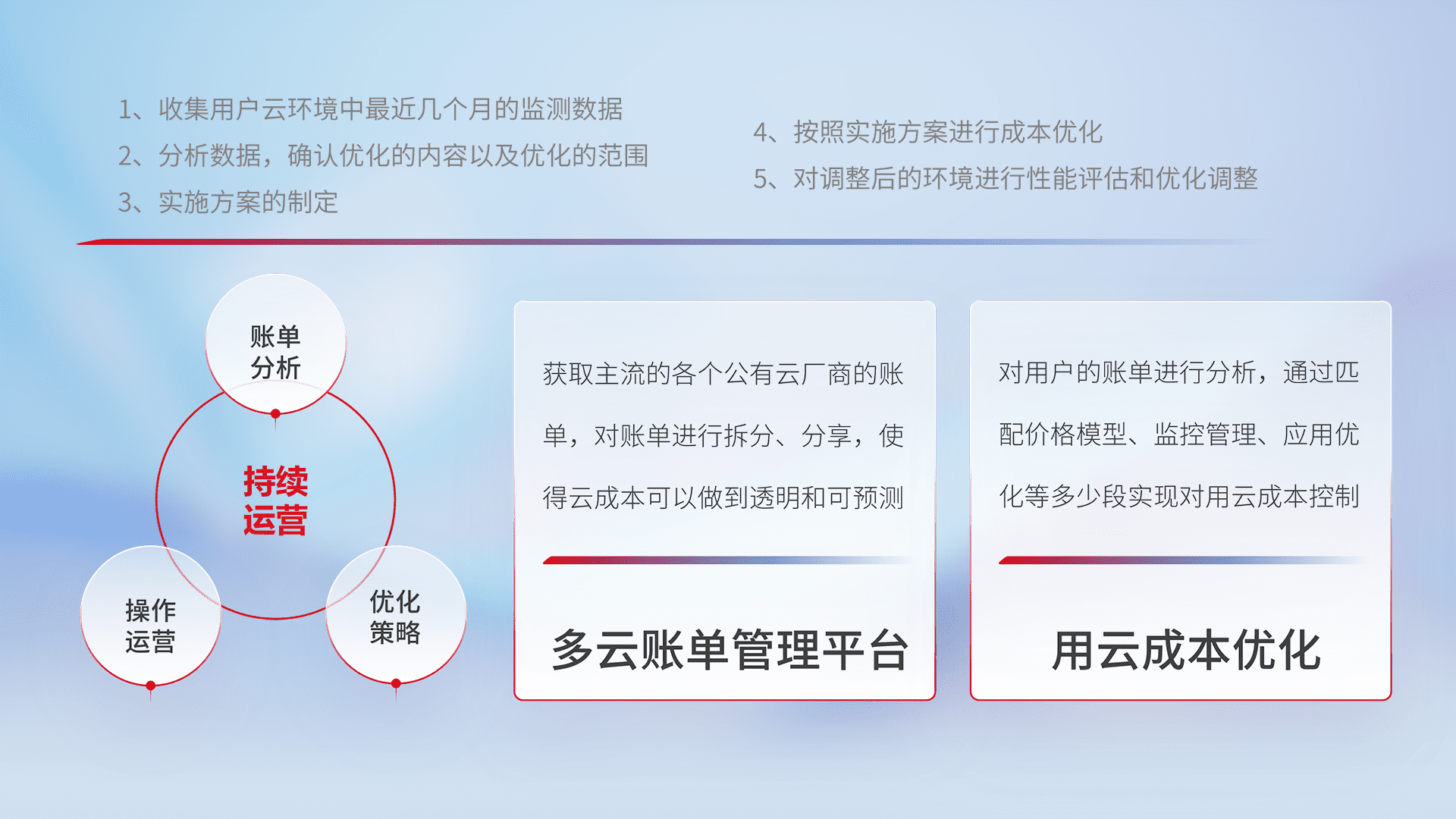 通过多云纳管,,以统一的资源数据模型把客户的云资源进行抽象和封装,,,进而实现对多云资源的统一操作,,保障云资源管理的可靠性、、稳定性与可用性。。。。量身定制化运维内容,,,配置、、开发运维、、、补丁管理、、、备份、、、监控、、、认证和访问管理、、审计和日常巡检等,,,,保障在用云过程中的可靠度,,,稳定度以及高可用率。。
